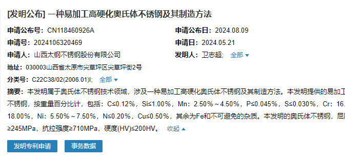 2024年8月9日,山西太鋼不銹鋼股份有限公司成功申請一項名為“一種易加工高硬化奧氏體不銹鋼及其制造方法”專利,申請公布號為CN118460926A,申請日期為2024年5月21日。